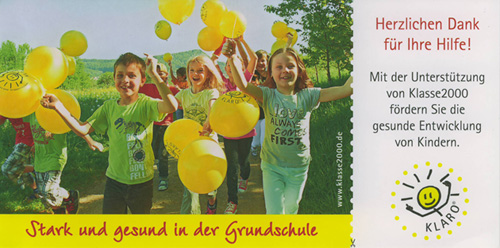 Klasse 2000 ist ein Unterrichtsprogramm, das die Kinder mit 15 Stunden pro Schuljahr von der 1. bis zur 4. Klasse begleitet. Es hilft ihnen gesund aufzuwachsen, sich zu Persönlichkeiten zu entwickeln, die ihr Leben aktiv gestalten und sich vor Gefahren wie Sucht und Gewalt schützen zu können. Die Inhalte werden kindgerecht vermittelt und geübt. Dazu gehören die Themen „Bewegen + Entspannen“ genauso wie „Kritisch denken + Nein-Sagen-Können“. Auch gewaltfreie Lösung von Konflikten oder gesunde Ernährung sind Themen. Die Inhalte der verschiedenen Jahrgangsstufen und das ganze Programm können Sie auch unter www.klasse2000.de nachlesen. Um die Kosten dafür zu decken, wird noch finanzielle Hilfe benötigt. Unser Förderverein möchte dieses Projekt unterstützen. Mit einer zweckgebundenen Spende können Sie uns einen Beitrag überweisen. Geben Sie dazu bitte den Verwendungszweck „Klasse 2000“ an. Wir stellen auch gerne eine Spendenquittung aus. Vielen Dank im Voraus für Ihre Unterstützung!